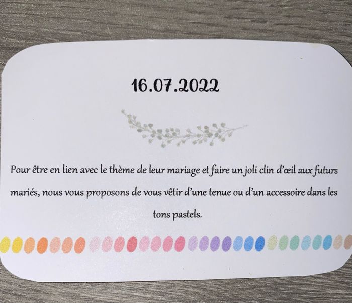 Bonjour à toutes et à tous ☺️ Petite question car je suis en train de préparer mes faire-part et je rajoute un petit carton dans l’enveloppe pour le dress code car nous faisons toute notre décoration sur les tons pastels (témoins et demoiselles...