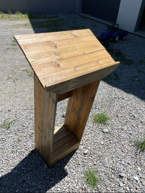 Coucou tout le monde , voilà notre petite création du jours , un pupitre pour notre cérémonie laïque. Vous en pensez quoi ? On pensait mettre des sticker sur le face devant, nos prénom ou quelque chose de plus passe partout , des idées ?