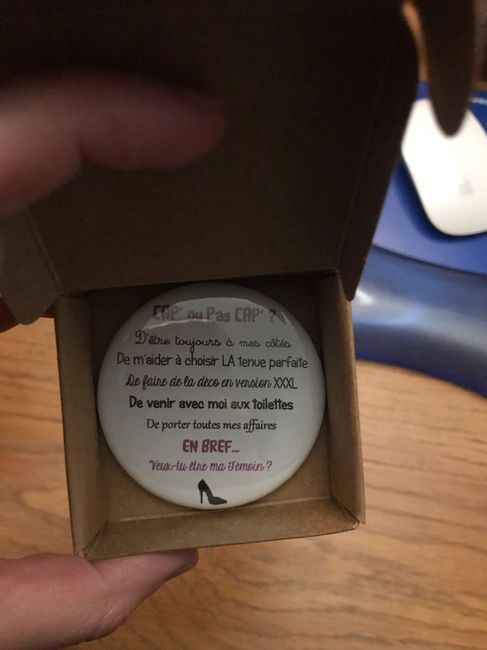 Coucou les filles, Je viens de terminer les box pour les deux témoins. J’offre la première samedi et l’autre en avril. La première aura un magnet avec la fameuse question et la deuxième un puzzle puisqu’elle adore ça avec aussi la question. Qu’en...