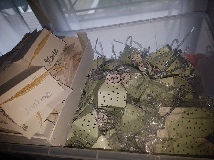 Salut les filles Mes petites avancées du jour Alors mon urne, découpée colé Mes marques places fini Et mes boîtes à dragées Une bonne chose de faite à J-81 Je crois haha