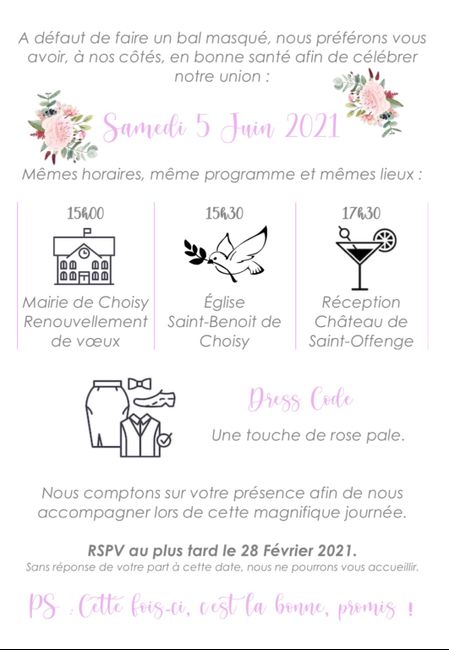 Bonjour tout le monde ! Nous devions nous marier le 20 juin 2020 mais nous avons pris la décision de décaler le mariage en 2021. Pour les personnes qui ont déjà décalées leur date avez vous un modèle de texte ou de petites cartes que vous auriez...