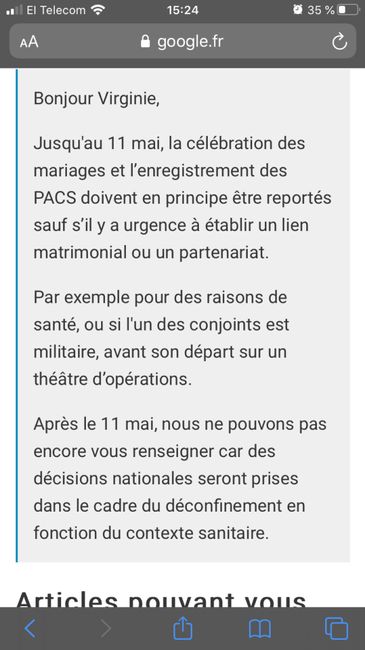 Coucou les filles, Le gouvernement annoncera ce jeudi 28 mai de nouvelles mesures qui seront applicable à partir du 2 juin pour une durée dans un 1 er temps de 3 semaines ( jusqu'au 22 juin ). Notre mariage civil est le 20 juin en petit comité chez...