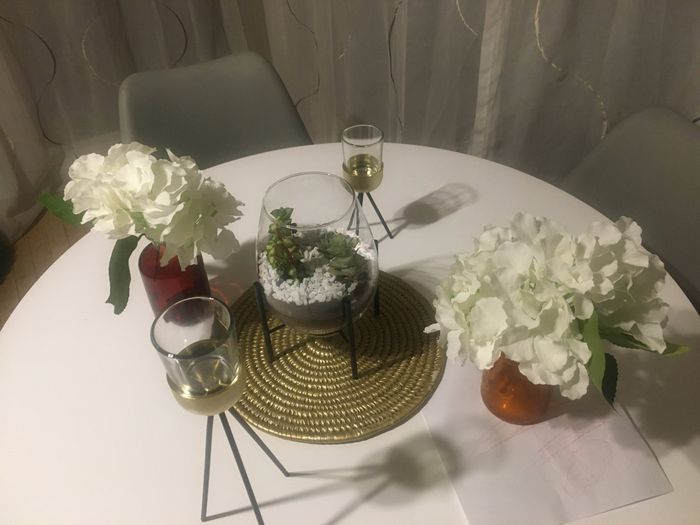 Bonjour, Je voudrais avoir vois avis svp. Bon les soliflores ça ne sera pas cela (J’ai pris ce que j’avais pour me faire une idée). J’ai aussi pris de s fleurs artificielles pour le test.Je voulais un terrarium en centre de table avec des hortensias...