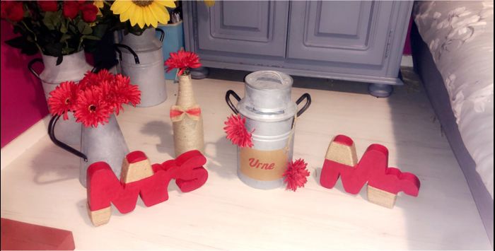On continue les préparatifs 🙏🤞🏻 - bouteille pour mettre centre de table - mr et mrs sur table des mariée- urne réalisée à partir d’un pot de lait - et ancien pichet en guise de vase à fleur Et pot de lait ancien pour mettre tournesol et rose ❤️❤️❤️ ...