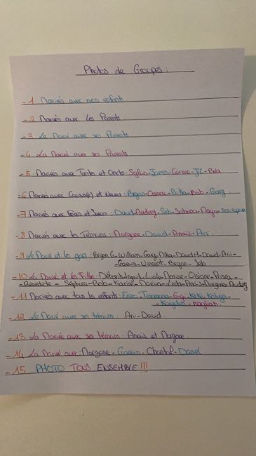 Coucou les filles, un peu stressée quand je me dis que notre mariage arrive à grand pas ! Alors j’ai décidée de me noté l’organisation de la journée avec les horaires et aussi les photos de groupes pour le photographe pour pas qu’il sois en galère...