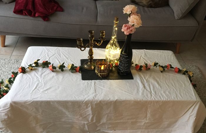 Coucou tout le monde Que pensez vous de notre essai? Sachant que dans la bouteille ça sera des vraies fleurs, à la place de la branche verte ça sera du lierre. Les tables seront rondes Sur chaque table il y aura un objet différent. Vous préférez...