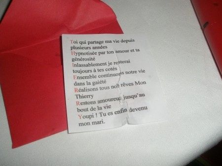 Avez-vous pensé à un petit discours personnel pour votre petit mari? je voulais vous faire partager mon idée.Je suis pas très douée en écriture (je suis comptable!)mais lors de mon mariage j'ai crée un petit mot avec les lettres du prénom de...