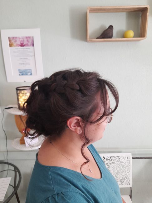 A la veille du mariage ma coiffeuse m'a refait un essai coiffure. Lequel préférez vous. Deuxième essai les mèches seront frisés Premier essai