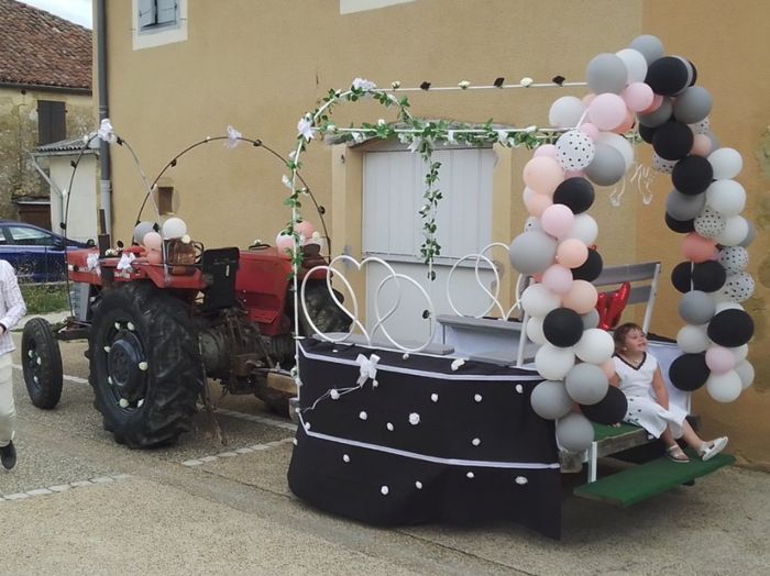 Bonjour. Pour mon arrivée on a trouvé une remorque tirée par un tracteur que l'on va décorer. Mon père a déjà fait quelques arrangements à la remorque. Je vous met des photos avant Et après modification Les colombes vont être accrochées à l'arche...