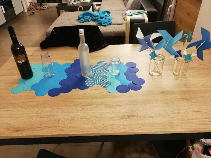 Voila, ma déco de table. 😊 Finalement je ne mettrai pas de moulins à vent, ça faisait trop chargé. Il manque un petit cadre avec le menu et les cadeaux invités 😊 ma table a 20 cm de moins que la table de la salle. Je suis trop contente 😊