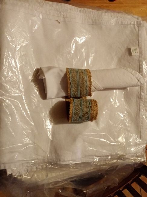 Une chose de faite:140 serviettes achetées à 0.60 pièce. Je suis ravie. Pour les ronds de serviettes, j'envisageais de faire comme sur la photo mais comment faire tenir la toile de jute ?