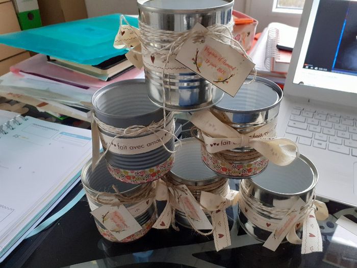Voici mes petites boites de conserves qui servent de pot pour les succulentes que je compte offrir aux invités 😉