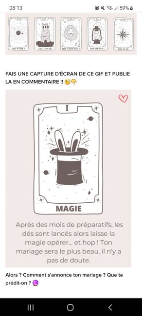 Coucou tout le monde 💜 Merci d'avoir participé jusqu'au bout ! Maintenant qu'on en sait un peu plus sur ton mariage, on va pouvoir tirer les cartes... FAIS UNE CAPTURE D'ÉCRAN DE CE GIF ET PUBLIE LA EN COMMENTAIRE !! 🧐👇 Alors ? Comment s'annonce ton...