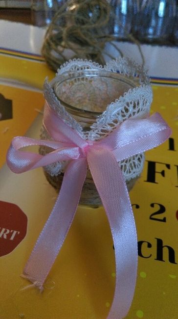 J'ai réalisé toutes les bouteilles d'eau, celles des boissons des enfants, les vases (bocaux), les numéros des tables (avec une petite buche coupée), une cinquantaine d'affiches vintages que j'ai plastifiées, plusieurs types de chamboule tout pour...