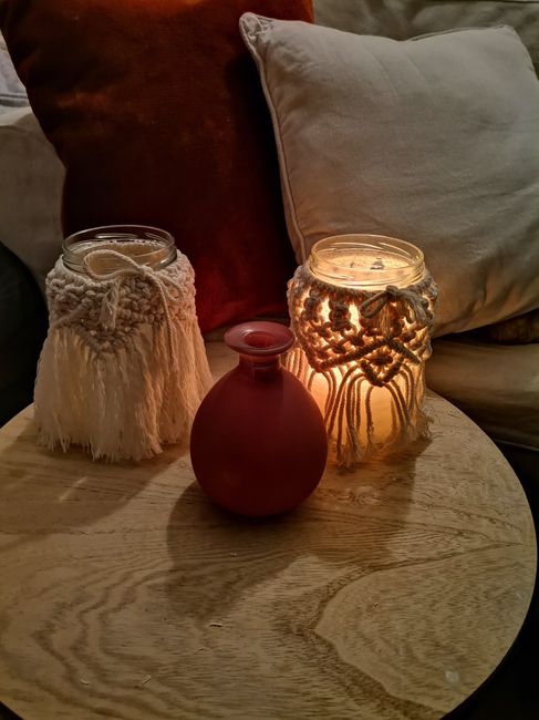 Hello les FM ! J'avance petit à petit sur la décoration. Voilà quelques idées pour celles qui auront le même thème que moi. - Petit base rond couleur terre où je mettrai des fleurs séchées ;-Pot en verre fait en macramé avec bougie à l'intérieur....