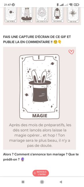 Coucou tout le monde 💜 Merci d'avoir participé jusqu'au bout ! Maintenant qu'on en sait un peu plus sur ton mariage, on va pouvoir tirer les cartes... FAIS UNE CAPTURE D'ÉCRAN DE CE GIF ET PUBLIE LA EN COMMENTAIRE !! 🧐👇 Alors ? Comment s'annonce ton...