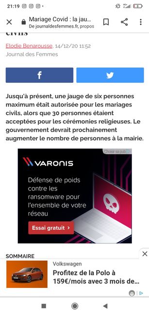 Hello ! On maintient notre mariage civil pour le 13/02/21 et on decalle la cérémonie religieuse+ fête à mai.. Jusque là on nous a toujours dit qu'on aurait le droit d'être que 6 à la mairie (nous 2+ nos deux témoins) autrement dit nos parents et...