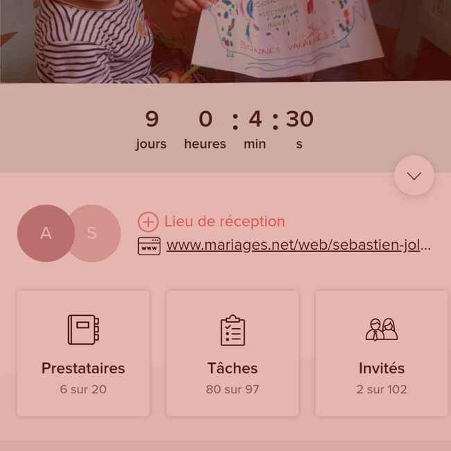 bonjour tout le monde ca y'est on passe la barre des 100 jours (enfin demain plus exactement) un petit bonheur de la journée, une petite étape qui nous rapproche du jour j et vous vos compteurs?