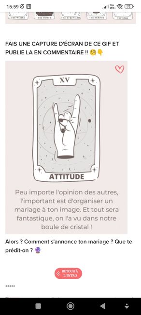 Coucou tout le monde 💜 Merci d'avoir participé jusqu'au bout ! Maintenant qu'on en sait un peu plus sur ton mariage, on va pouvoir tirer les cartes... FAIS UNE CAPTURE D'ÉCRAN DE CE GIF ET PUBLIE LA EN COMMENTAIRE !! 🧐👇 Alors ? Comment s'annonce ton...