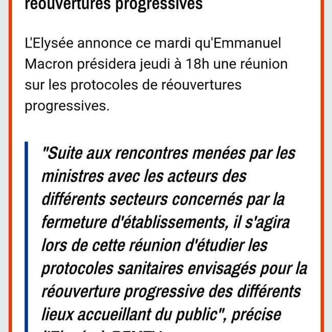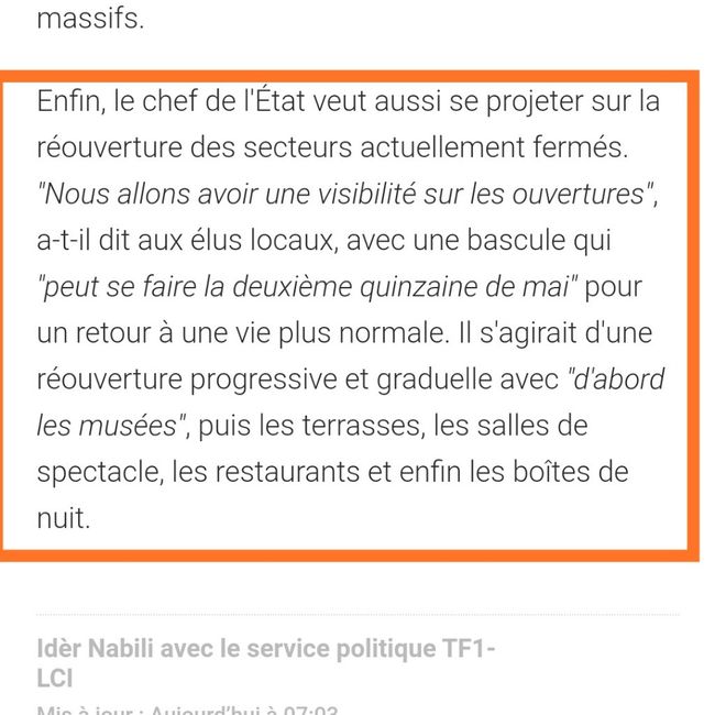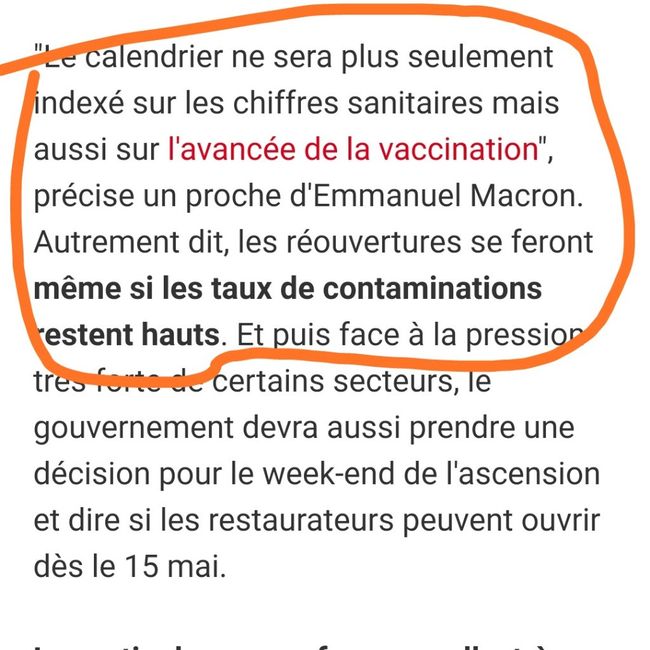 Bonjour les Fm, Je suis tombée sur cet article ce matin. Que comprenez vous ? Que la vie normal (ou à peu près) sera pour la quinzaine de mai ou alors que les ouvertures vont commencer seulement à la mi mai ? Merci