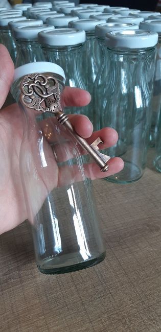 Bonjour à tous Comme beaucoup d'entre vous ont des idées géniales je me tourne vers vous ! Pour les invités nous offrons une petite bouteille contenant un kit à cookies et une clé vintage décapsuleur accrochée à la bouteille pour la gente masculine....