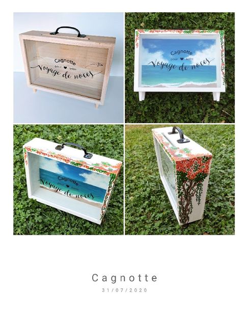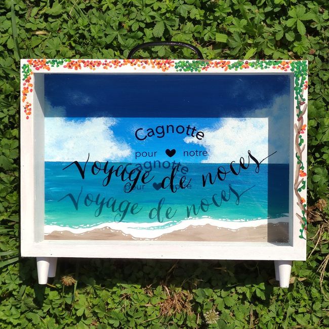 Coucou à toutes ! Je viens de finir de peindre l'urne que j'avais acheté sur Etsy. Qu'est ce que vous en pensez ? J'étais partie sur l'idée de représenter une sorte de fenêtre donnant sur le lieu de notre futur voyage de Noces (si le Covid le...