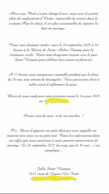 Coucou les fm! Après deux reports nous voici enfin mariés! Et ouf, avec 230 invités, pas un seul nez qui coule! On peut enfin respirer! Un petit message de soutiens et une énorme pensée pour vous, ne baissez pas les bras, cette journée sera magique!...