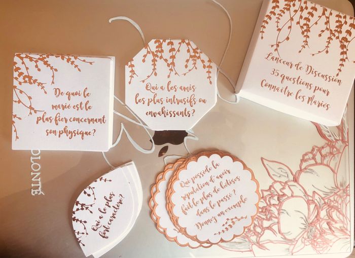 Hello, pour que vos invités puissent entamer la discussion sur les tables où tout le monde ne se connaît pas. J’ai trouvé l’idée sympa ce petit lanceur de discussion . Si cela peut vous aider un peu 😉
