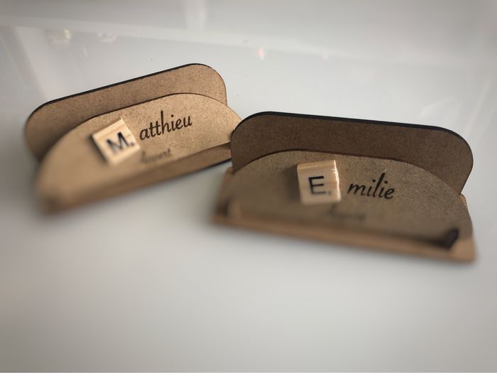 Hello, Voilà le prototype du plan de table! A la place des chapeaux et lotus il y aura le nom des gens, chacun retrouvera son nom, récupérera son porte clé et retournera le jeton et trouvera son numéro de table. Le fond sera bombé en or rose et on...