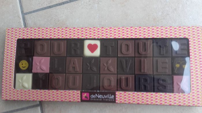 Voici mes dernières acquisitions : Une spéciale dédicace pour mon chéri. Je lui offrirai une boîte avant notre mariage avec quelques surprises dont ces chocolat avec notre phrase 😍 Des cadres ou j ai imprimé le contenu cet après midi De quoi...