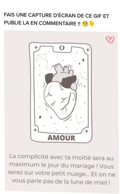 Coucou tout le monde 💜 Merci d'avoir participé jusqu'au bout ! Maintenant qu'on en sait un peu plus sur ton mariage, on va pouvoir tirer les cartes... FAIS UNE CAPTURE D'ÉCRAN DE CE GIF ET PUBLIE LA EN COMMENTAIRE !! 🧐👇 Alors ? Comment s'annonce ton...