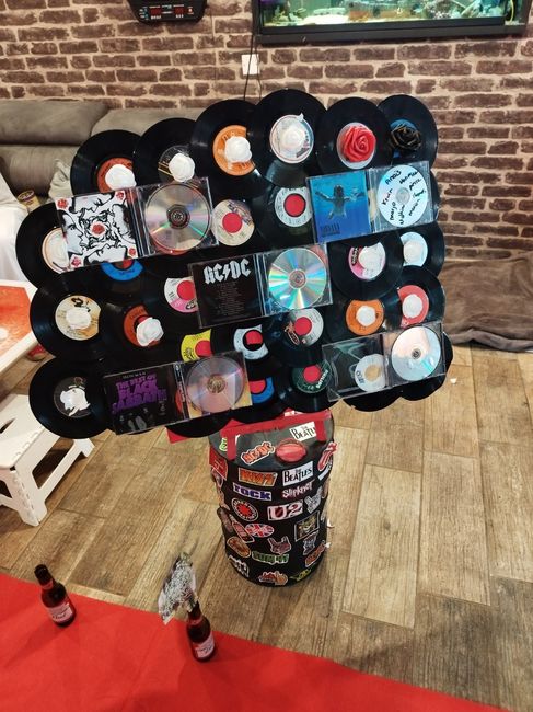 Il y a 1343 joursQu'en pensez vous ??? J'ai fait un petit test (les tables sont pas à la même hauteur)... Thème Punk RockSur les vinyle au dessus de la bouteille ça sera les menus, sur les bouteilles il y aura des piques Dans les cassette il y a une bougie led...