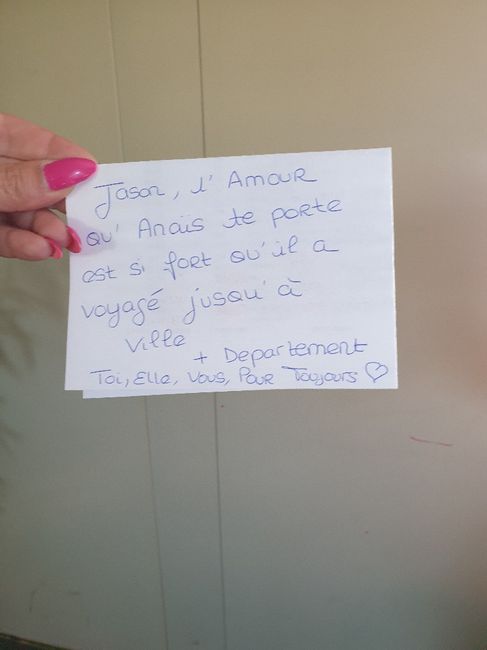Bjr à tous Je suis a un mois du mariage (le stress monte !!). Ma surprise de love note stagne un peu. J ai vraiment besoin de votre aide : si vous pouviez m accorder un peu de votre temps. Écrire un petit mot sur un bout de papier avec écrit : Jason,...