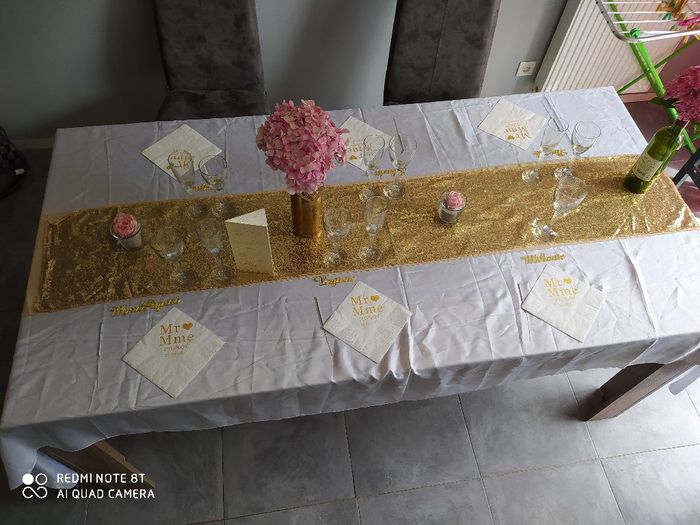 Bonjour tout le monde ! A un peu moins d'un an du mariage nous avons fait des test de déco de table . J'ai pris quelques photos, j'attends vos avis 😉 La nappe ne sera pas celle ci mais sera blanche et évidemment il y aura des couverts ...