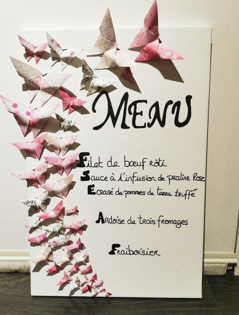 Bah voilà... Moi qui me suis toujours décrite comme ayant 2 mains gauches... J'ai réussi à aller au bout de mon idée de menu ! Il sera à l'entrée de la salle, avec le plan de table. Je suis fière de moi ! Je suis allée au bout 🤪 mais je suis pas...