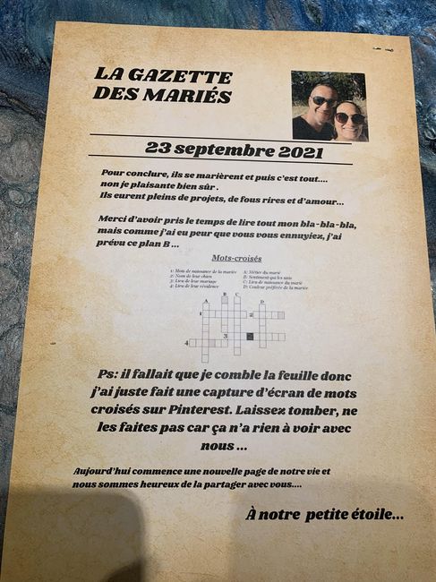 Bonjour à toutes, J'aimerais réaliser une gazette des mariés. L'une d'entre vous aurait t'elle une trame à me transmettre ? Merci par avance pour vos réponses et votre aide.