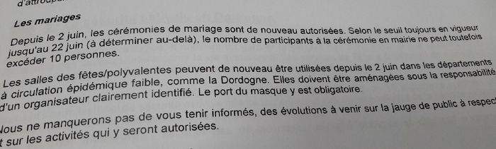 Bonjour, je me tourne vers vous car la salle polyvalente pour mon mariage du 26 septembre 2020 est toujours fermée. La mairie me dit d attendre le 22 juin mais c est interminable... Certaines d'entre vous on des infos ??? Merci