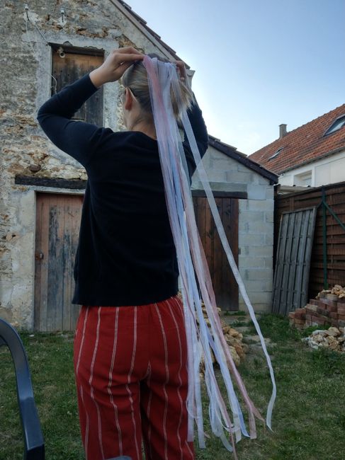 Je n'aime pas forcément l'idée que toutes les femmes se bousculent pour attraper le bouquet alors j'ai opté pour la ronde des rubans. Ce n'est pas encore rependue, la majorité des invités ne connaissaient pas, de quoi capter leur attention le temps...