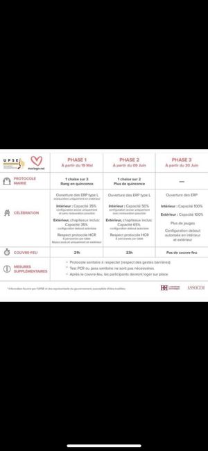Coucou les filles! Voici un document officiel concernant les réceptions à venir. Le domaine dans lequel nous nous marions a une capacité de 200 personnes. Jauge à 35% soit maximum 70 personnes et nous sommes 55 🤩 l’organisation sera différente vu...