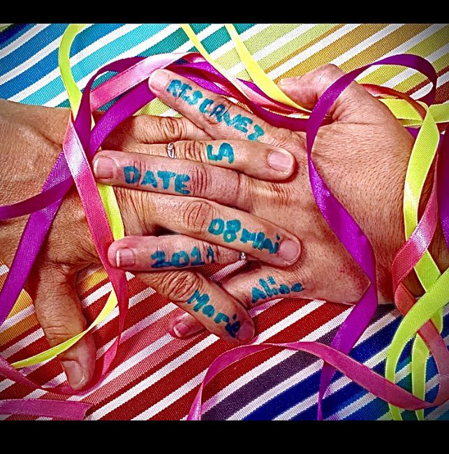 Salut les filles Création de notre Save the date hier !!!!Notre thème étant la vie en couleurs , je vous présente ce que nous allons envoyer à nos invités pour notre cérémonie laïque Bises à toutes et merci de vos retours 😘Aline