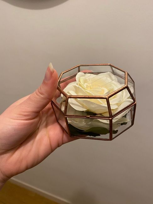Bonjour ! Je vous écris ce soir car besoin d’un petit conseil 😊 Pour nos alliances nous avons fait construire une boîte avec nos initiales gravées (photo juste en dessous). J’ai acheté une rose artificielle blanche et les alliances reposeront dessus....