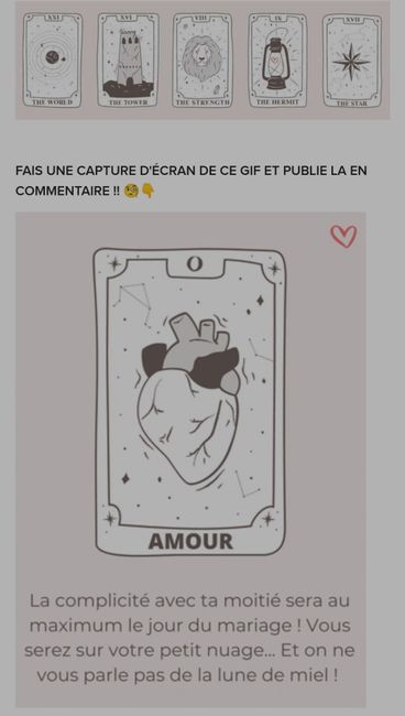 Coucou tout le monde 💜 Merci d'avoir participé jusqu'au bout ! Maintenant qu'on en sait un peu plus sur ton mariage, on va pouvoir tirer les cartes... FAIS UNE CAPTURE D'ÉCRAN DE CE GIF ET PUBLIE LA EN COMMENTAIRE !! 🧐👇 Alors ? Comment s'annonce ton...