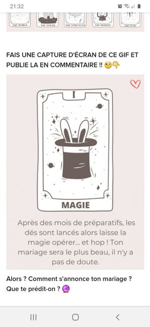 Coucou tout le monde 💜 Merci d'avoir participé jusqu'au bout ! Maintenant qu'on en sait un peu plus sur ton mariage, on va pouvoir tirer les cartes... FAIS UNE CAPTURE D'ÉCRAN DE CE GIF ET PUBLIE LA EN COMMENTAIRE !! 🧐👇 Alors ? Comment s'annonce ton...