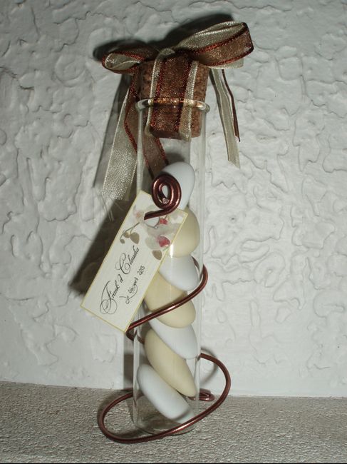 je fais appel à toutes celles qui ont des idées J'ai décoré mes éprouvettes (contenant à dragées) en verre avec une petite plume rouge et un petit coeur (je vais prendre une photo).Je vais déposer à chaque personne une éprouvette à côté du...