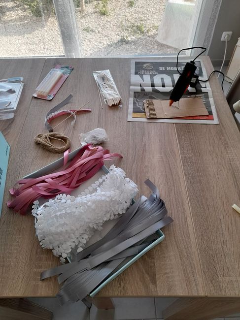 Bonjour, voilà a 50j du mariage je me suis dit qu'il fallait peut etre que je me mette dans ma déco mdr Alors hier soir essai noeud voiture et commencement des baguette de ruban. Je n'en voit pas le bout une ceintaine a faire de chaque. Les boites a...