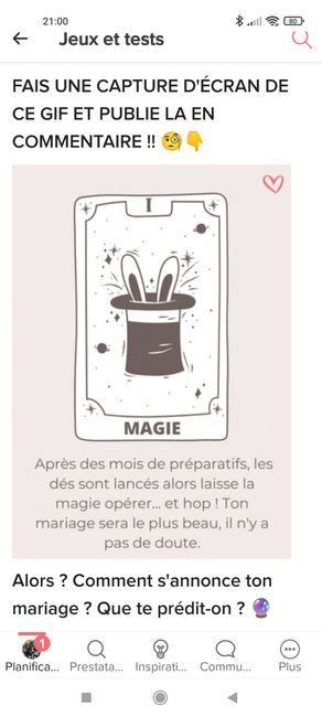 Coucou tout le monde 💜 Merci d'avoir participé jusqu'au bout ! Maintenant qu'on en sait un peu plus sur ton mariage, on va pouvoir tirer les cartes... FAIS UNE CAPTURE D'ÉCRAN DE CE GIF ET PUBLIE LA EN COMMENTAIRE !! 🧐👇 Alors ? Comment s'annonce ton...