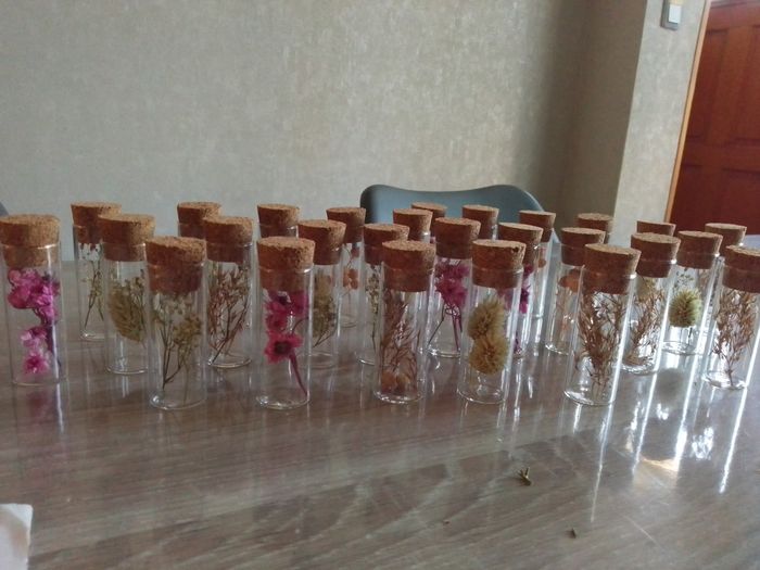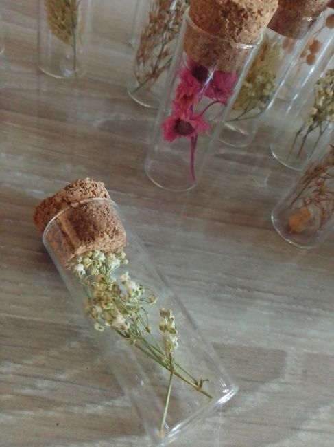 Bonjour à toutes.. Voici nos cadeaux invités,enfin un des cadeaux car il y en aura plusieurs 😄 ,des petites fioles en verres de fleurs séchées ! ...Sauf que je coince 😥sur la présentation ,je ne sais pas comment les disposées pour que ça présente...