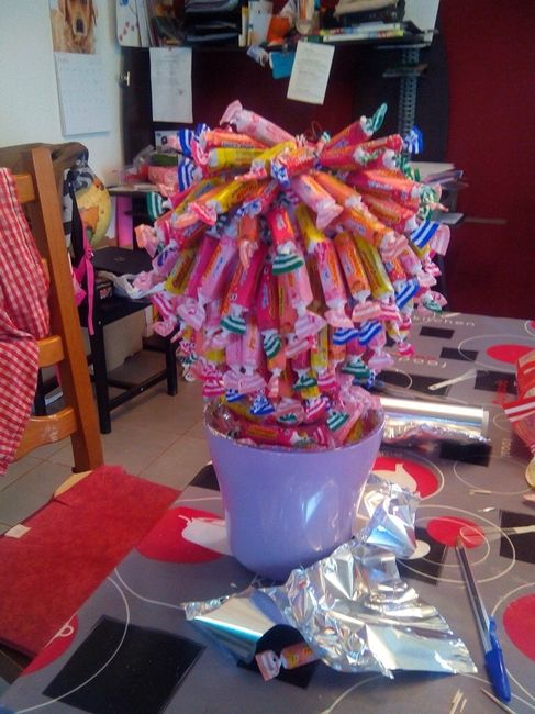 voici notre centre de table c'est des arbres a bonbon il men faut 10 avec des bonbon different