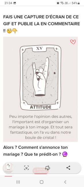 Coucou tout le monde 💜 Merci d'avoir participé jusqu'au bout ! Maintenant qu'on en sait un peu plus sur ton mariage, on va pouvoir tirer les cartes... FAIS UNE CAPTURE D'ÉCRAN DE CE GIF ET PUBLIE LA EN COMMENTAIRE !! 🧐👇 Alors ? Comment s'annonce ton...