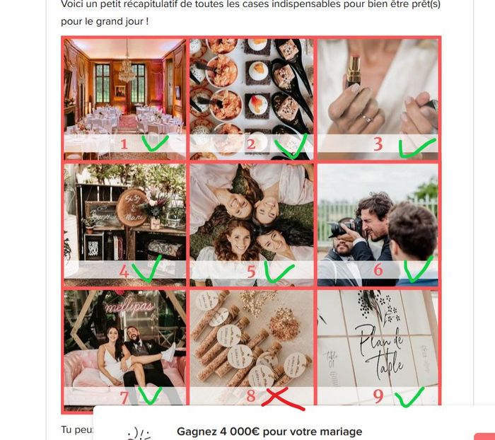 Si tu viens de tomber sur cette page c'est que tu as pu répondre à toutes les questions précédentes de notre loto nuptial ❤️ ! Si ce n'est pas le cas, clique-ici 👉 Le loto nuptial 🎟️💍 Voici un petit récapitulatif de toutes les cases indispensables...